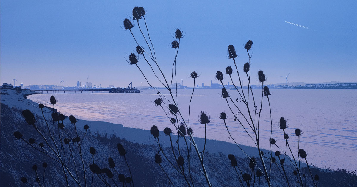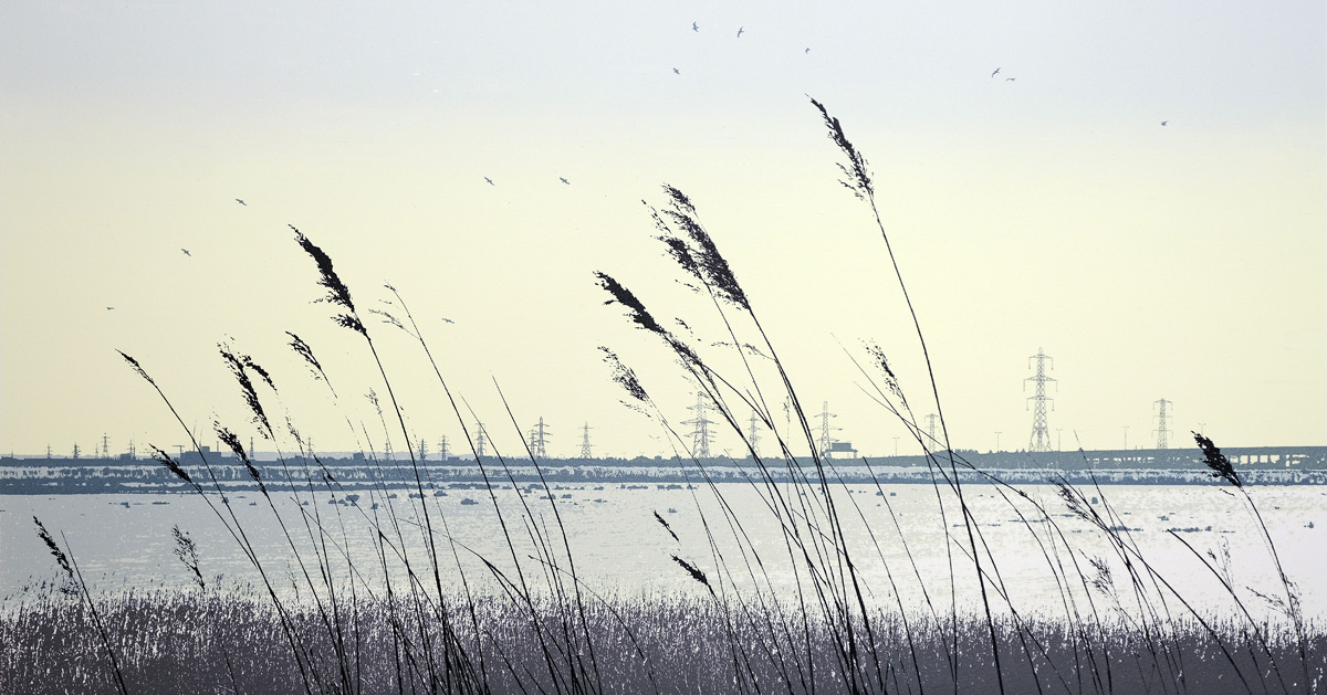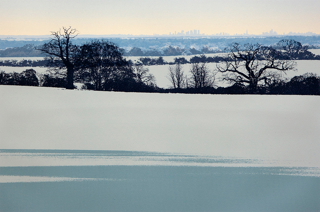 Often in my landscapes, human interventions, such as stone walls on Pennine hillsides or pylons on the Thames Estuary, are contrasted with natural features such as trees and reeds; thereby emphasizing the fragile balance between the man-made and the natural.