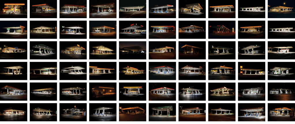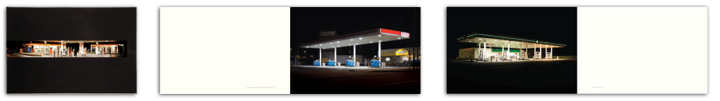 My own petrol station project developed out a fascination with the glow from illuminated signs. The brightly lit canopies with their glowing strips of branding, red for Esso, green for BP, yellow and red for Shell were part of this subject matter. Like Ruscha, I wanted to create a photographic ‘map’ and the A1 was the obvious choice as it connects my home in London to my parent’s house in Yorkshire.